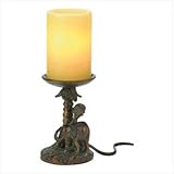 Safely enjoy the magic of candlelight most anywhere! Clever lamp boasts a real wax shade, casting the cozy ambience of a real-live candle with no dangerous open flame or messy dripping wax. Sculpted base in rich verdigris copper finish features a charming miniature elephant-and-palm-tree jungle scene. Polyresin base; wax shade. 4-watt bulb included. UL approved cord.4" diameter x 11" high.