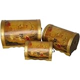 A remarkable Amazon.com product offering, 7 designs of Asian art design nested trunks, sets of 2 or 3, traditionally given as wedding, anniversary, housewarming, graduation, or birthday gifts- present for new beginnings. These trunks are shipped inside of each other, carefully packed and wrapped, so no damage in shipping, since the begining of the Ming dynasty! Each set is decorated with a classic Fukian art motif, intended to bring happiness and good fortune to the household. The price of each set is incredibly cheap, because we purchased a large warehouse full of these trunks, once they are gone- that's it! Hand crafted from kiln dried elmwood, great for storing blankets, linens, sewing, and certainly- toys. Use one in the bedroom, one in the living room, and one in the family room. Visit our Amazon storefront for the web's largest selection of Asian design furniture, art, lamps, statues, gifts, natural window blinds, and Japanese style room divider shoji screens- choose 2, 3, 4, 5, 6, & 7 feet tall, choose 2, 3, 4, 5, & 6 panels wide, choose from 20 colors, choose from 40 designs!