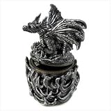 A ferocious winged dragon crouches on a lidded chest, keeping a close watch over your treasures within. Pewter-look trinket box makes a dashing statement! Weight 0.8 lb. Polyresin. 3 1/2" x 3 1/2" x 4 3/4" high.