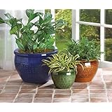 Bring a burst of color to your garden! Embossed earthenware flower pots are sumptuous in shades of azure, topaz and peridot. Set includes three separate sizes to hold a variety of your favorite greenery! Drain hole at bottom of each pot. Ceramic. Large: 12" diameter x 8 1/2" high; Medium: 9" diameter x 6 1/2" high; Small: 6 1/2" diameter x 5 1/4" high.