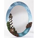 A sunny lighthouse scene complete with seagulls and a rocky coastline makes up the frame for this oval wall mirror. Alabastrite. 10 5/8" x 1 1/8" x 13 3/8" high.