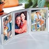 5X7 SILVER PLATED CLASSIC TRIPLE FRAME Display your precious photos in this classy triple frame! Adorned by a sleek silver border, this frame beautifully displays three of your timeless photos. Attached with hinges for different angular displays. Makes a stunning gift as well as a lovely display piece that will be cherished by anyone!