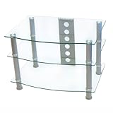 The airy looks of the Walker Edison Freeson television stand put the emphasis where it should be--on the picture, instead of on the furniture. Crafted from beveled tempered safety glass and powder-coated metal tubing, the stand holds up to 250 pounds on its 8mm-thick top shelf. The two lower shelves are 6mm thick and provide ample room for DVD players, game consoles, and movie collections. The stand's legs have a contemporary look, while a backside cutout panel keeps cords organized and out of sight. Measuring 24 by 32 by 22 inches, the stand is great for compact spaces and ships ready to assemble with all necessary tools included. Variations in color and size are also available.