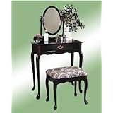 The Heirloom Cherry Vanity Set is a sophisticated and practical addition to your bedroom. The Queen Anne style vanity is finished in beautiful dark heirloom cherry and features an oval high-quality adjustable glass mirror. The vanity has solid hardwood legs and is made of durable hardwood and veneers.This vanity offers a full-size drawer with exquisite brass plated hardware for all your favorite accessories. The coordinating bench is upholstered with a lovely black floral fabric. Table: 28"L x 16"D x 50"H, Stool: 18"L X 15"D X 18"H.