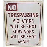 This reproduction metal sign has been aged along the edges to give it a slightly risty , distress ed look. The sign reads "No Trespassing Violators will be shot Survivors will eb shot again" It looksgreat in home bars, patios, tiki bars, decks or bedrooms. The sign measures 15 inches tall and 12 inches tall.