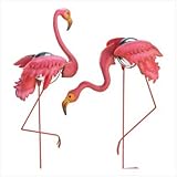 These fabulous flamingos will add a whimsical splash of festive color to your lawn! The classic American yard decoration gets extra appeal with modern-day metal sculpture; spring-mounted necks bob playfully in the breeze, while a gleaming gazing ball nestled between each bird's wings transforms sunlight into a dazzling display. Stake-bottom makes installation easy. Metal. Each is 8 1/4" x 13 3/4" x 38 1/4" high. Set of 2