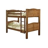 The charming country style of Linon's Shutter twin-size bunk bed makes a homey addition to a kids' bedroom. Crafted of solid Brazilian Pine with a warm Pecan finish, the bed features slatted headboards and footboards topped by attractively arched rails. The bed frame offers thick square corner posts, safety rails on the upper bunk, and an attached ladder. The bed can also be configured as matching twin beds and coordinates with the Shutter five-drawer chest and nightstand. Some assembly required.