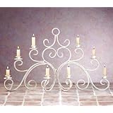 Swirls of metal hold eight taper candles in this large, graceful candelabra. An impressive piece of shabby elegance. Wrought iron in distressed ivory finish. 27 1/2 x 6 1/2 x 14 1/2 high.