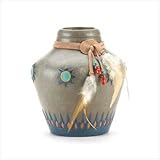I came across this pot while browsing Amazon, (along with another at the link enclosed), after I put up a window shelf in my study that is done in a Western/Native American decor.I have a couple of plants on the shelf and wanted to surround them with some pottery with a southwestern or American Indian flavor.I quickly found out that true southwestern pottery of an authentic nature is way beyond my budget.And I would hazard to guess beyond that of a lot of folks as well. I opted to purchase this and a companion piece sold by the same company.They were both reasonably priced and appeared a decent size.I have to say I was most pleased when both of these pots arrived.They are of a nice heavy ceramic with a rough matte finish that gives it a very authentic look and feel.And the artwork on both is very well done and most handsome indeed.(This one is a little smaller and of a different style than the companion piece also purchased). I consider this piece as well as the other pot to be both excellent choices and worthy additions to anyones room or home done in a southwestern or native American design.Though they probably could never be confused with true hand made American Indian pottery by an expert, it's my guess however that most people viewing them in ones home would never know the difference. They are larger in size than one would imagine, (they were to me) as well as very handsomely painted and sturdier material than one would expect for the price.Both vases also come with rawhide and feather tassels attached as well.I highly recommend both of these fine looking pots for yourself, or as a gift for someone that favors southwestern decor.They are both beautiful pots and very much worth the price asked for them here on Amazon...CERAMIC BUFFALO SOUTHWESTERN DECORATIVE POT FEATHERSClick Here to see more reviews about: COLORFUL SOUTHWESTERN POT