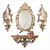 Baroque-style mirror, shelf and candle sconces with tapers in gorgeous golden tones bring ornate elegance to any room. Plastic tapers included. Plastic. Mirror 6" x 11" high.