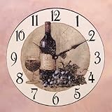 A wine glass, bottle, and grapes decorate the center of this handsome wall clock. Uses one AA battery, not included. 13 1/8 diameter x 1 1/2 high.