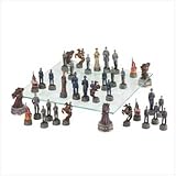 Each piece of this remarkable set is a miniature work of art, marching across a frosted-glass "battlefield". Lifelike horse-head corner columns hold the board aloft. A truly theatrical twist on the classic game of strategy and an absolute "must" for Civil War collectors and chess fanatics alike! Comes complete with polystone pieces and etched glass board. Each playing piece is approximately 1 5/8" diameter x 5 5/8" high; board is 21 1/2" diameter x 1/2" thick; each corner column is 3 1/8" x 4 1/2" x 5" high.
