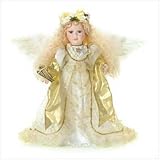 In a splendid gold-accented gown, her blonde curls cascading past her shoulders and her harp at the ready, she's a winged wonder indeed! Porcelain head, arms and legs. Polyester dress. 17 1/2" x 4 1/2" x 16" high.