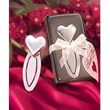 HEART SHAPED BOOKMARK FAVORS Each 2 ¾ "by 1" bookmark features a classic heart shape perched at the top of a sturdy metal clip. Bookmarks always make festive and useful party favors and the exclusive Marks of Excellence bookmarks collection offers something for every occasion. Each comes individually packaged in a delurxe clear topped gift box with a black bottom, tied with a white organza bow and attached heart shaped thank you tag. Get right to the heart of the matter with these cheery heart shaped bookmark favors. Appropriate for every occasion, its easy to share the joy of love with these heart design bookmark favors.